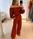 Macacão ombro a ombro com elástico, mangas compridas e corte mais reto. Vem com cinto forrado no mesmo tecido para fazer a marcação da cintura e deixar você ainda mais bonita.